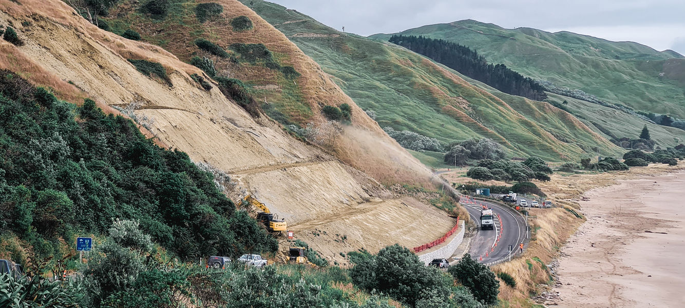 A large slip came down at Markorori Beach, blocking one lane on SH35.